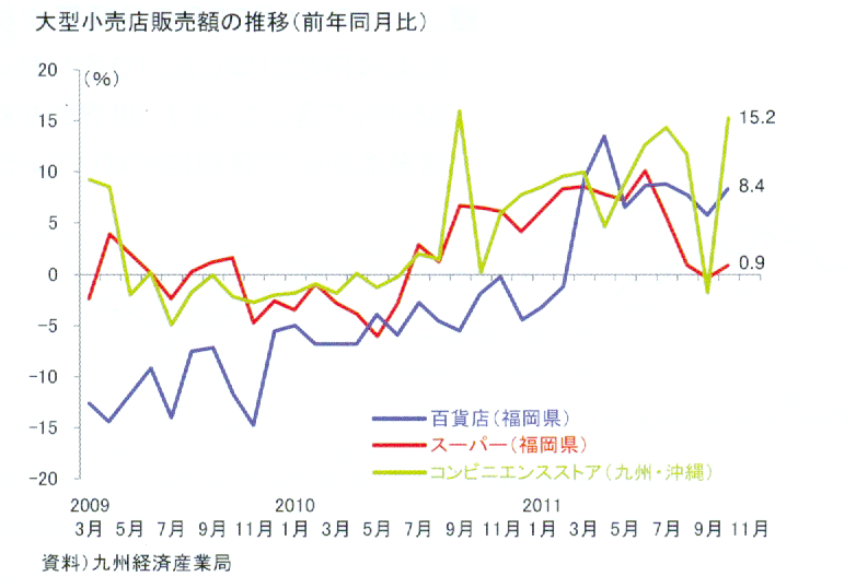 福岡県における大型小売店販売額は百貨店が前年同月比8.4%増、スーパーが同0.9%増となりました。
