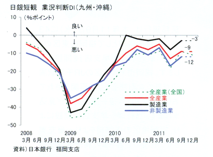 九州・沖縄「企業短期経済観測調査(短観)」によると、経済の現状を示す業況判断DIは、全産業でマイナス9となり、6月調査に比べ4ポイント改善しました。